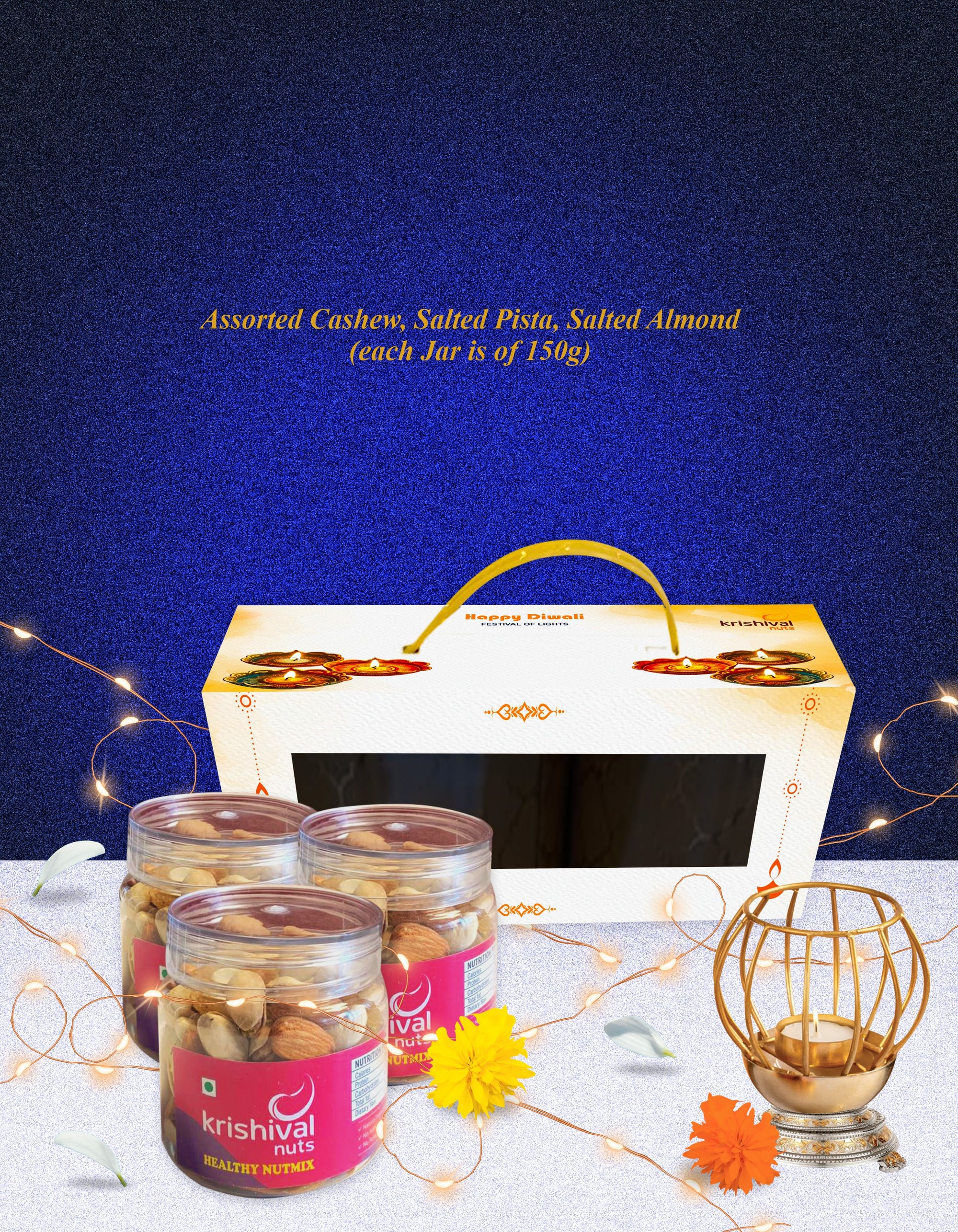 Celebrate Diwali the healthy and elegant way with Krishival Diwali Triple Celebration Jar Box — a premium dry fruits combo featuring Salted Almonds, Assorted Cashews, and Salted Pistachios, each packed in 150 g airtight jars.